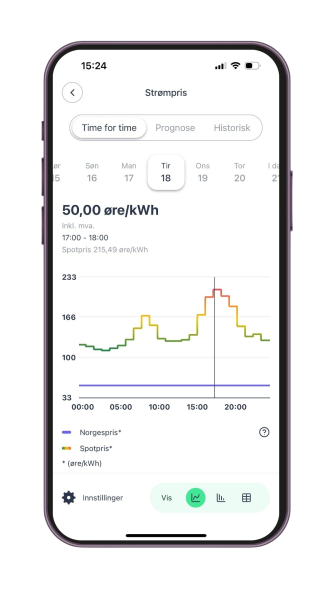 Ofte følger strømprisen døgnrytmen beskrevet over, men ikke alltid. I Vibb-appen kan du se spotprisen time for time, også kommende dag etter klokka 13.